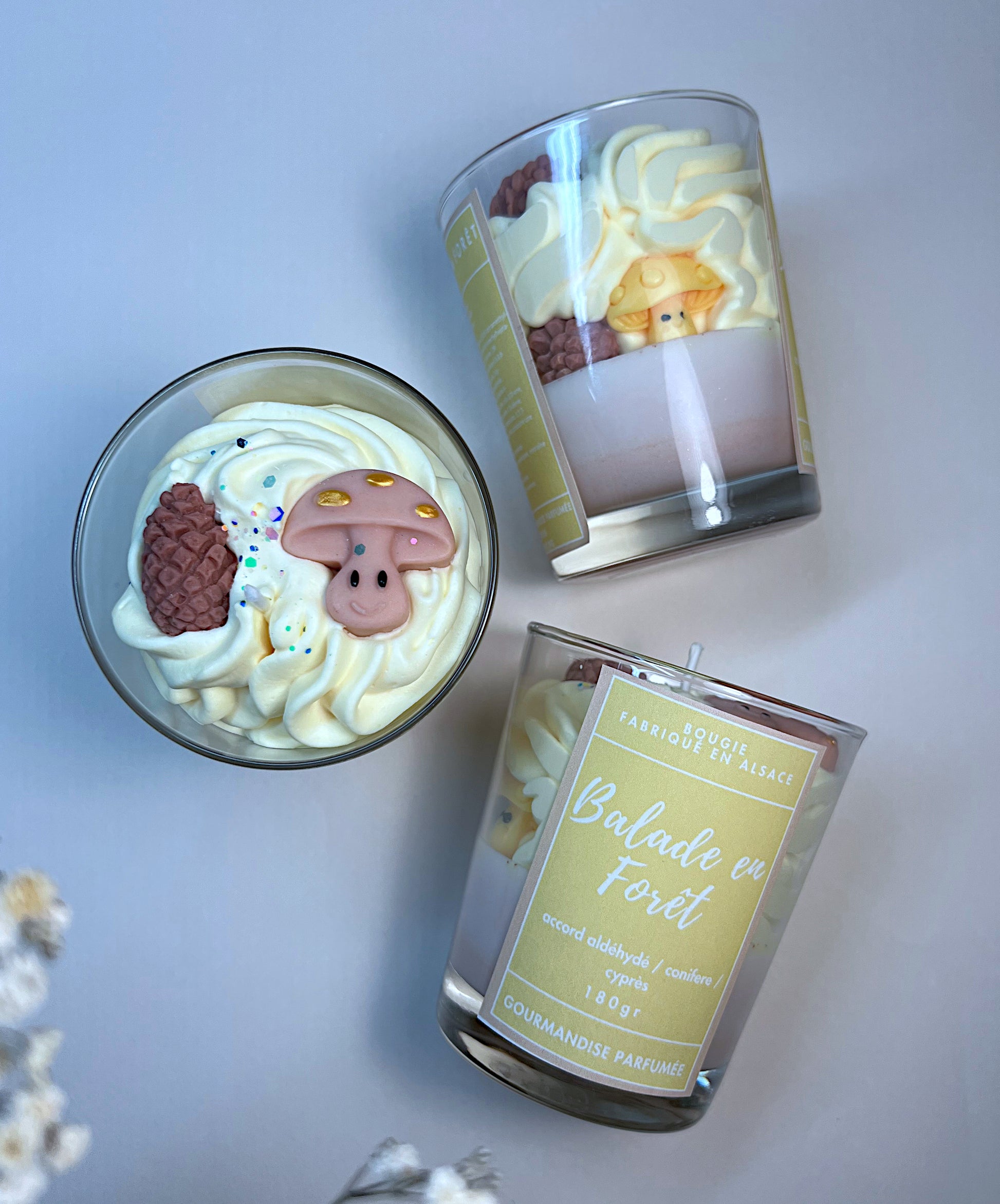 Des champignons décorés à la main, des mini pommes de pin en cire, et une senteur bois-mousse-pins qui vous transporte au cœur de la forêt 🍃✨