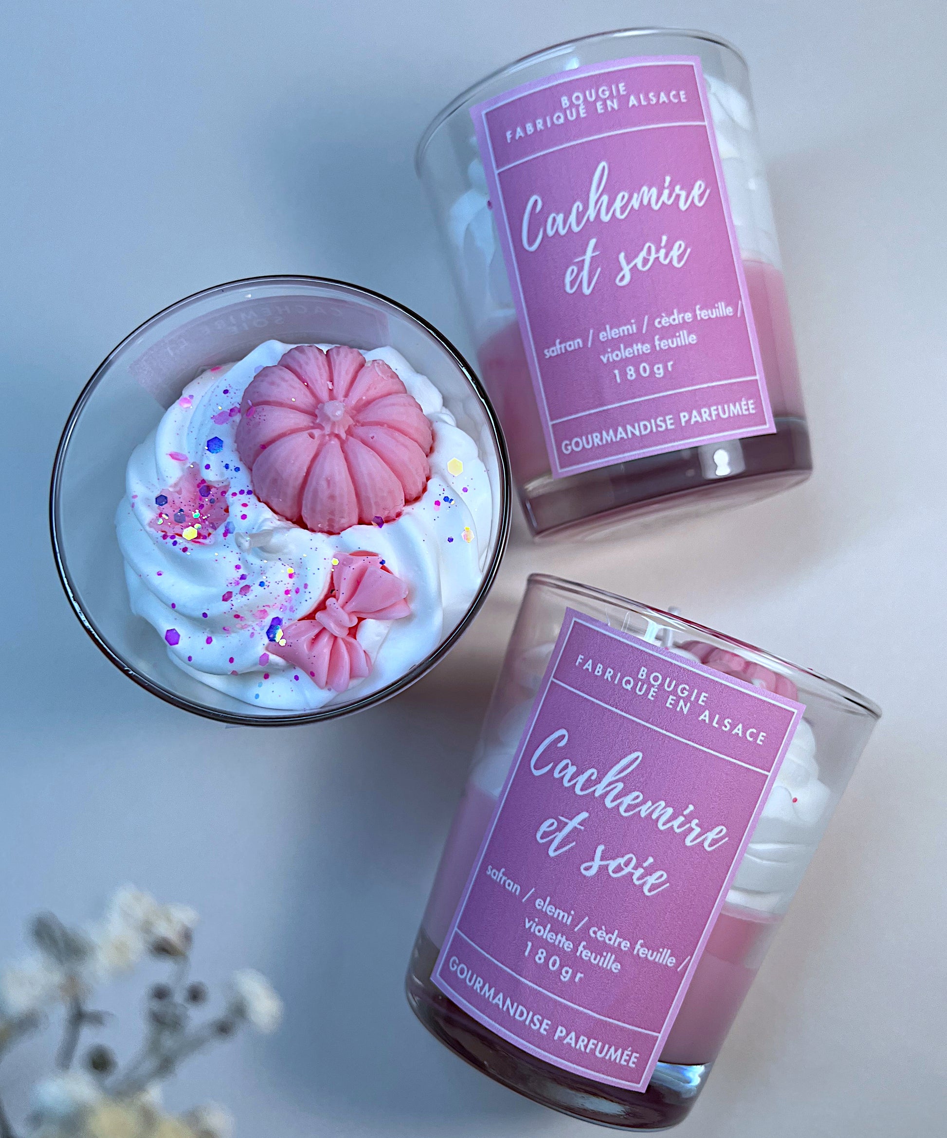 Plongez dans un automne réconfortant, doux comme un pull en cachemire et enveloppant comme un voile de soie. Cette bougie mêle des notes chaudes de safran et d’élémi, adoucies par un cœur feuillu de cèdre et de violette, pour une ambiance cocooning et élégante. 🌸 Une interprétation rose et poétique de l’automne, loin des citrouilles classiques. Ici, la saison se teinte de douceur, de crème fouettée parfumée et de petites décorations roses sculptées à la main.