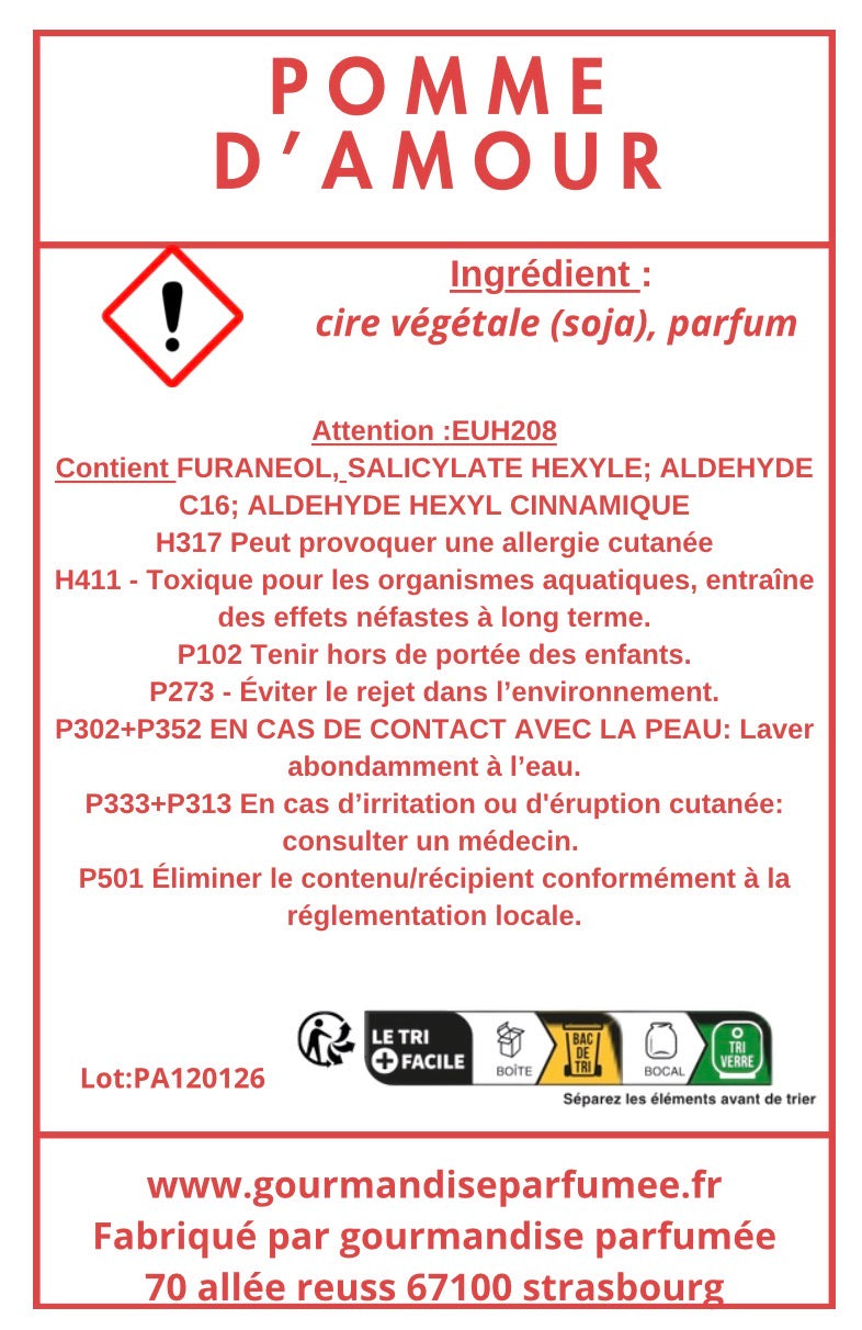 À l’allumage, cette bougie parfumée Pomme d’Amour libère un parfum fruité, sucré et légèrement caramélisé, mêlant la fraîcheur de la pomme à des notes sucrées rappelant le sucre fondu. Elle crée une ambiance chaleureuse, réconfortante et délicieusement gourmande dans votre intérieur.